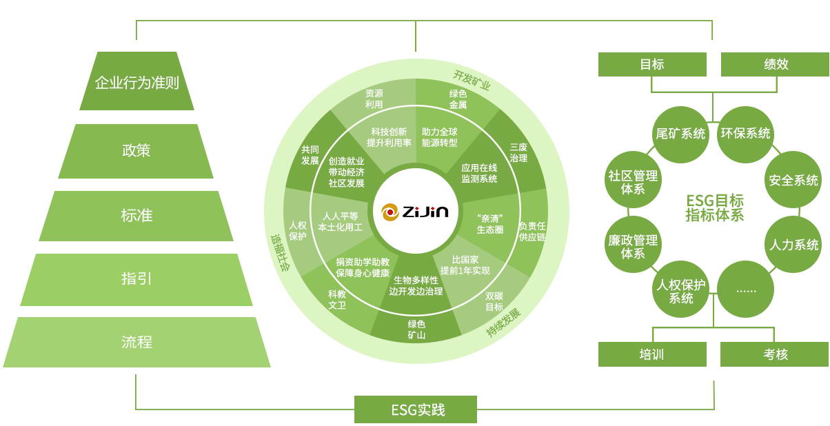 公司坚持遵循国际标准构建具有紫金特色的环境、社会和管治(ESG)体系,全面推进绿色高质量生态矿山发展。公司坚持“开发矿业、造福社会”的共同发展理念,坚持“和谐创造财富,企业、员工、社会协调发展”为企业价值观,努力让更多人因紫金矿业的存在而获益,先后三次荣获“中华慈善奖”。