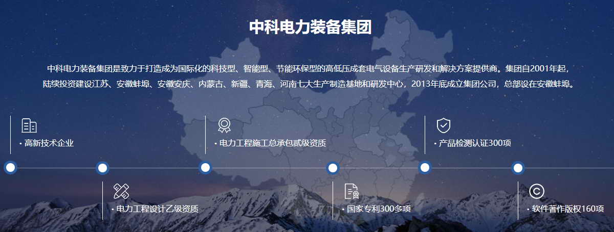 中科电力装备集团有限公司是全国电力装备行业唯一一家集专业设计、研发、生产、销售、安装、维护于一体的高端智能化电力装备制造企业,致力于打造成为国际化的科技型、智能型、节能环保型的高低压成套电气设备生产研发和解决方案提供商,同时拥有国家电力工程设计乙级资质、国家电力工程总承包二级资质。集团被认定为“国家高新技术企业”,连续多年跻身“中国企业500强”,“中国制造业企业500强”,荣获“中国电力行业管理创新奖和中国电力设备管理特别贡献奖”。